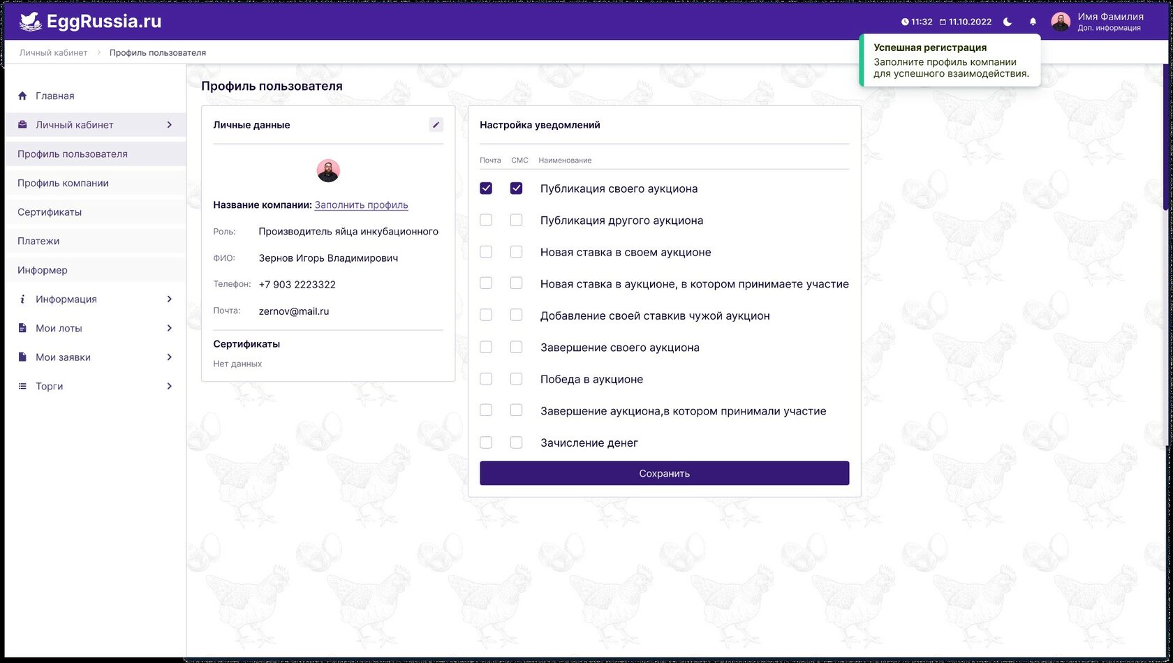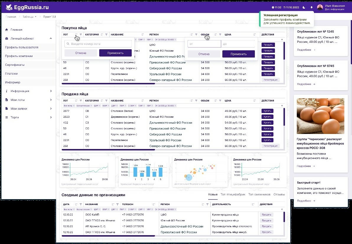 Информер – позволит оперативно получать информацию о встречных заявках, используя выставленные фильтры пользователем, на электронную почту или СМС. Такой информер может быть особенно полезен для тех, кто занимается покупкой или продажей сельскохозяйственной продукции на постоянной основе и нуждается в быстром доступе к актуальной информации об опубликованных лотах. Кроме того, такой инструмент поможет сократить время на поиск подходящих заявок и повысить эффективность работы.