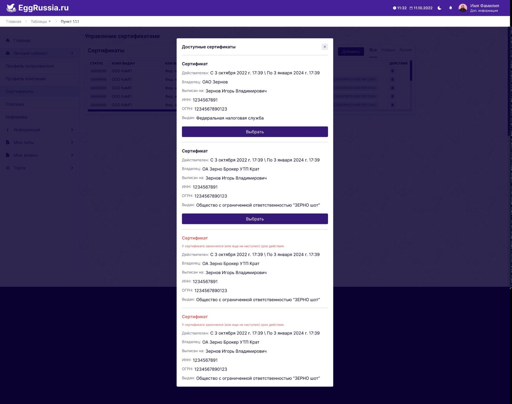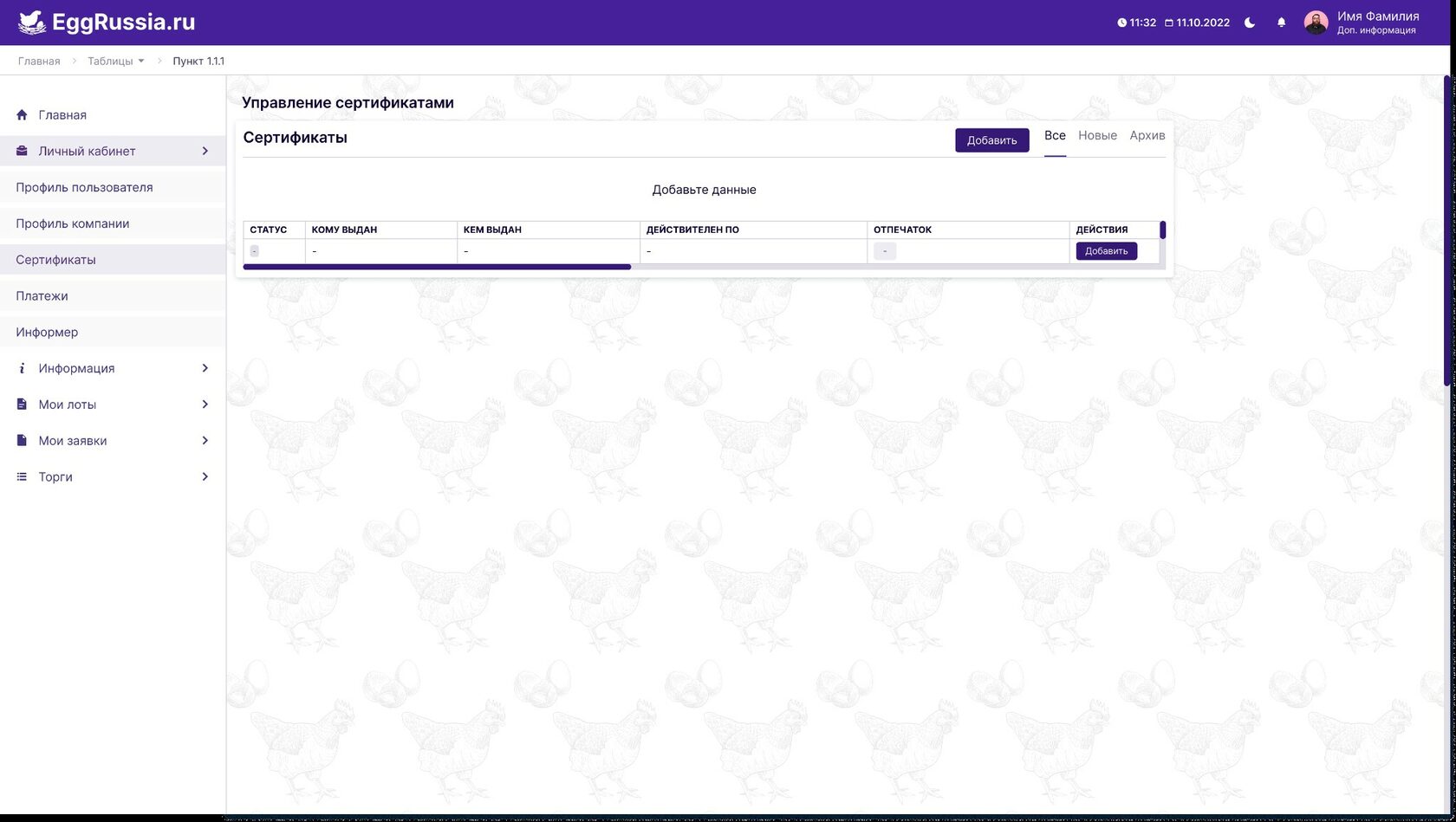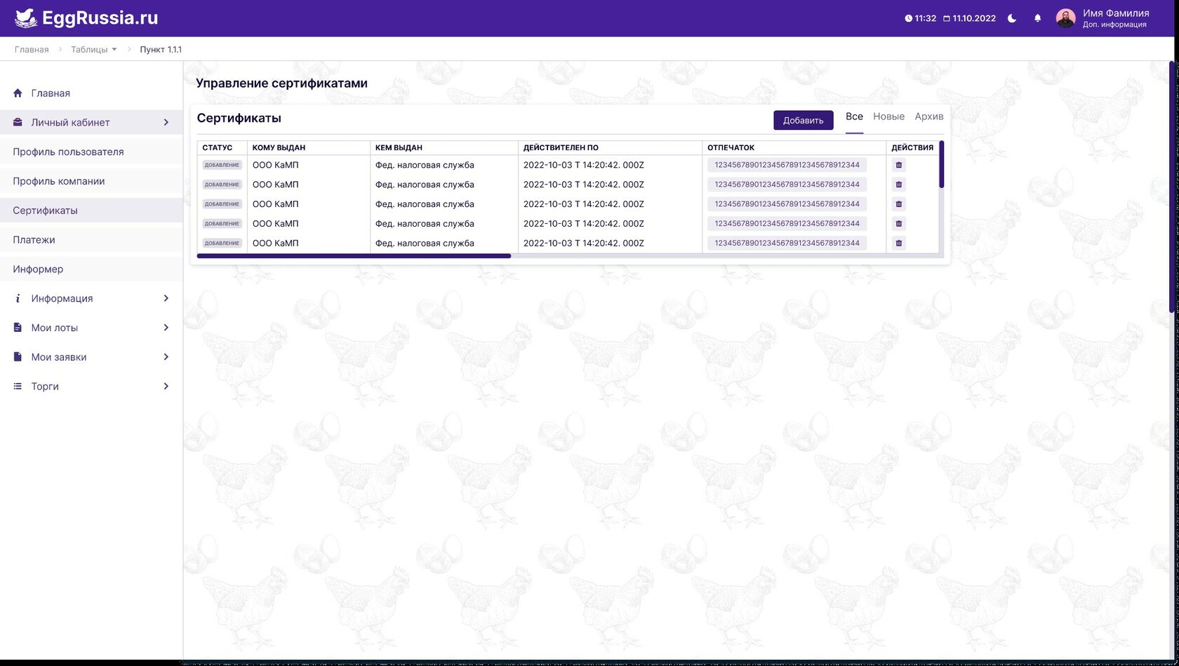Раздел “Сертификаты” предназначен для прикрепления сертификатов с помощью которых пользователь может подписывать документы за приобретенный товар на бирже (выигранные сделка с продающим пользователем).
