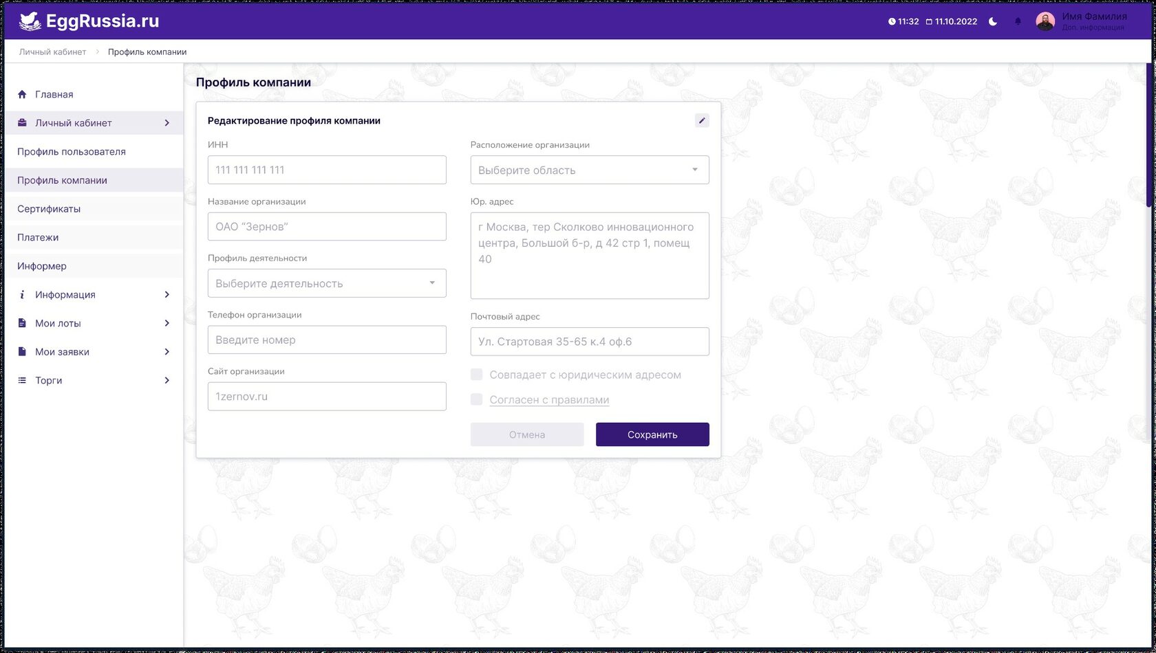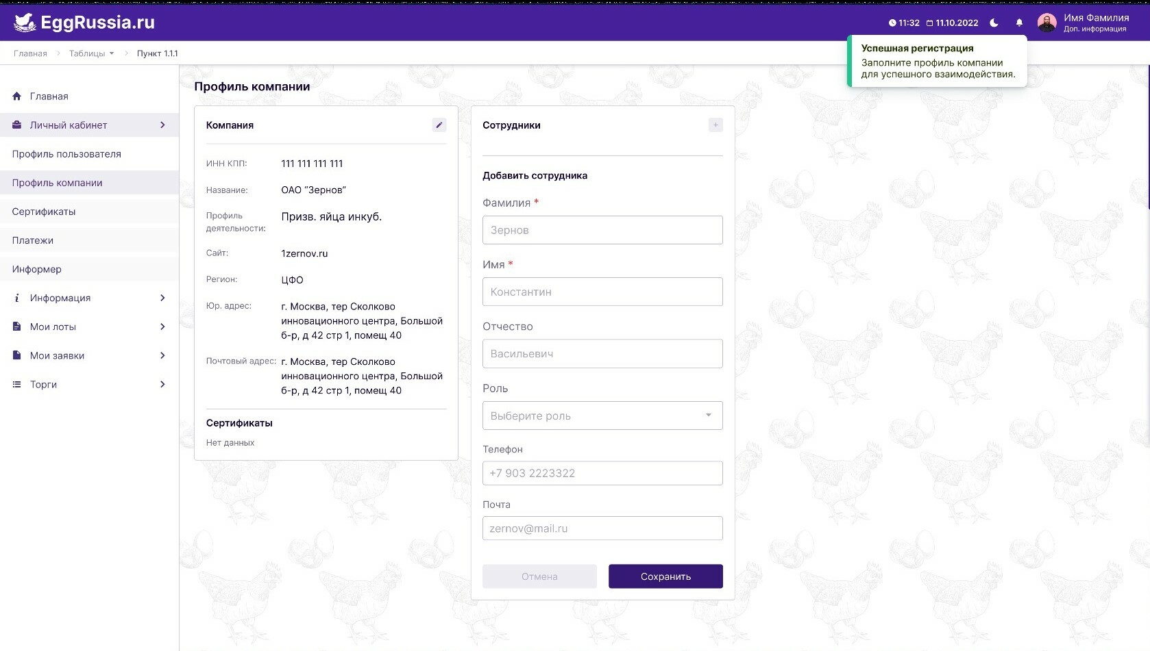 Чтобы создать профиль, перейдите в левом боковом меню в «Профиль компании». При необходимости Вы сможете дополнить или изменить информацию после создания профиля, а также поменять регионы загрузки и выгрузки. После пройденной регистрации пользователю доступен функционал заполнения профиля пользователя.