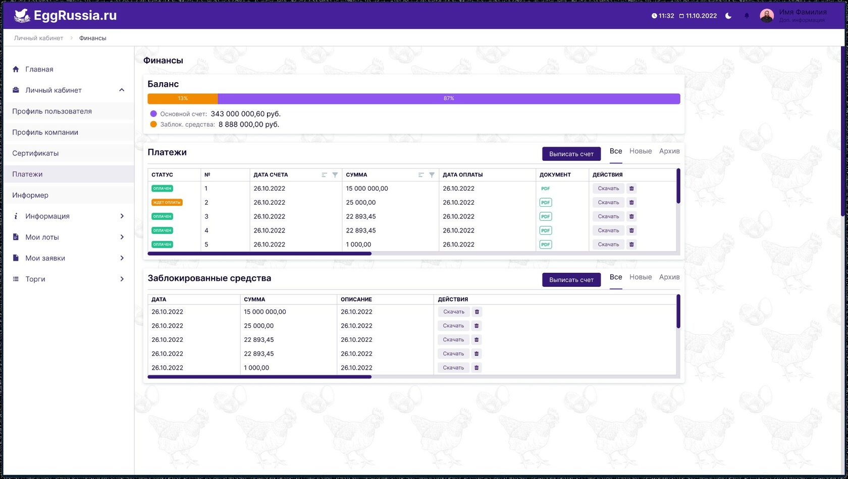 Раздел “Платежи” предназначен для пополнения личного кабинета пользователя с помощью выставления счета и оплаты. При нажатии на кнопку “Выставить счет” открывается форма с помощью которой можно выставить счет, сформированный счет попадает в раздел платежи со статусом ожидает оплаты с информацией: номер, дата создания счета, сумма, дата совершения оплаты (если пользователь еще не оплатил, то данное поле должно быть пустым), документ (PDF), действия (скачать и удалить).
